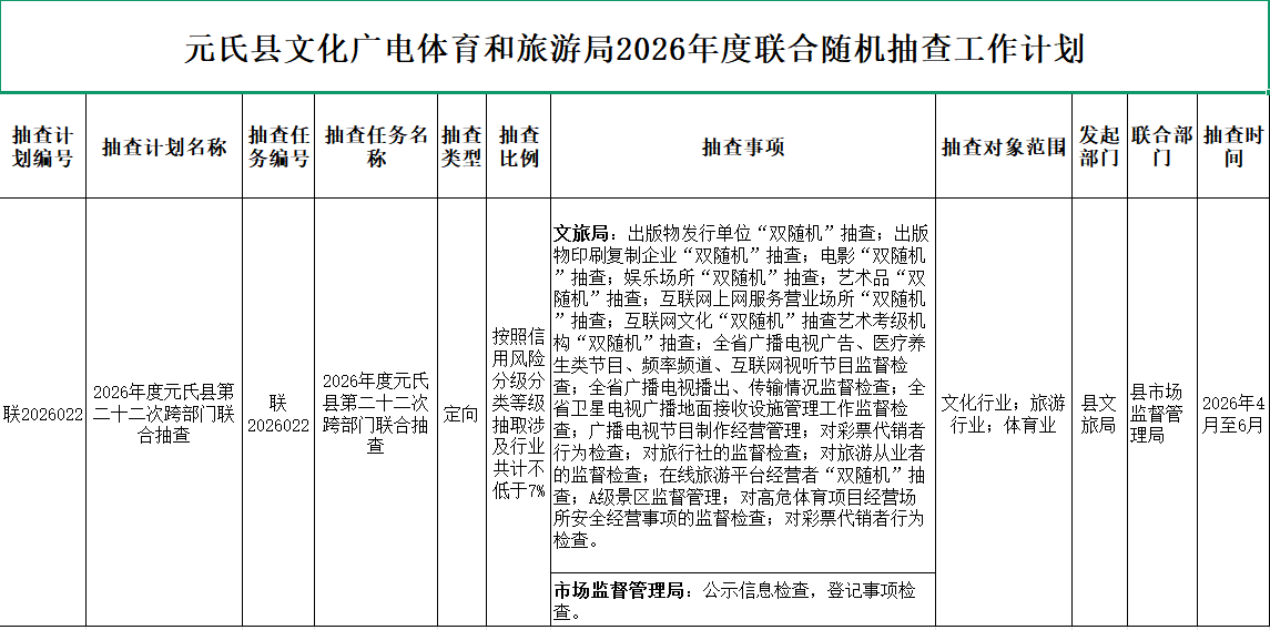 元氏县文化广电体育和旅游局2026年度部门联合随机抽查工作计划