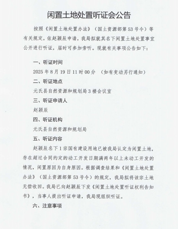 关于赵颖辰闲置土地处置听证会的公告