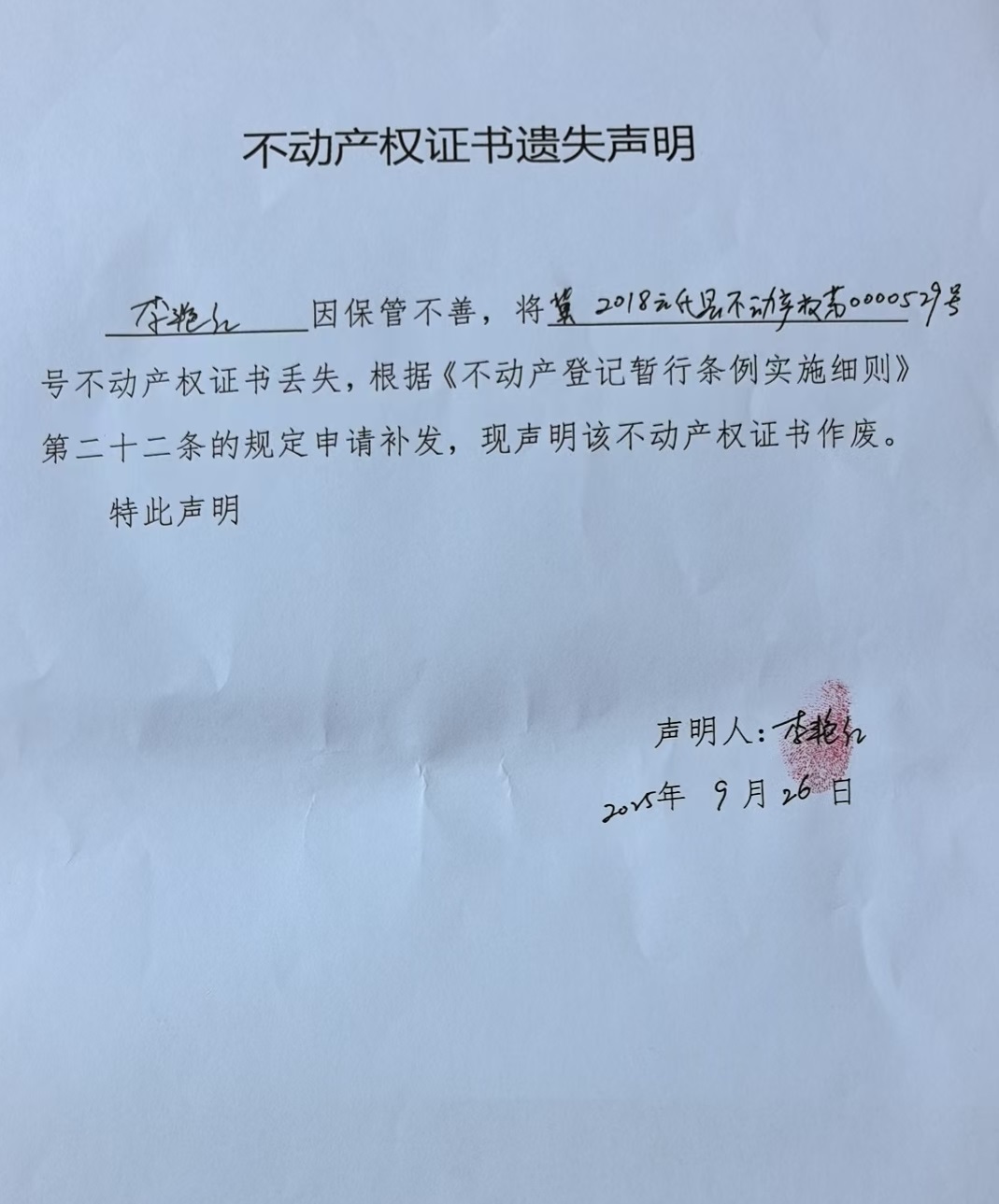 关于李艳红不动产权证书遗失声明的公告