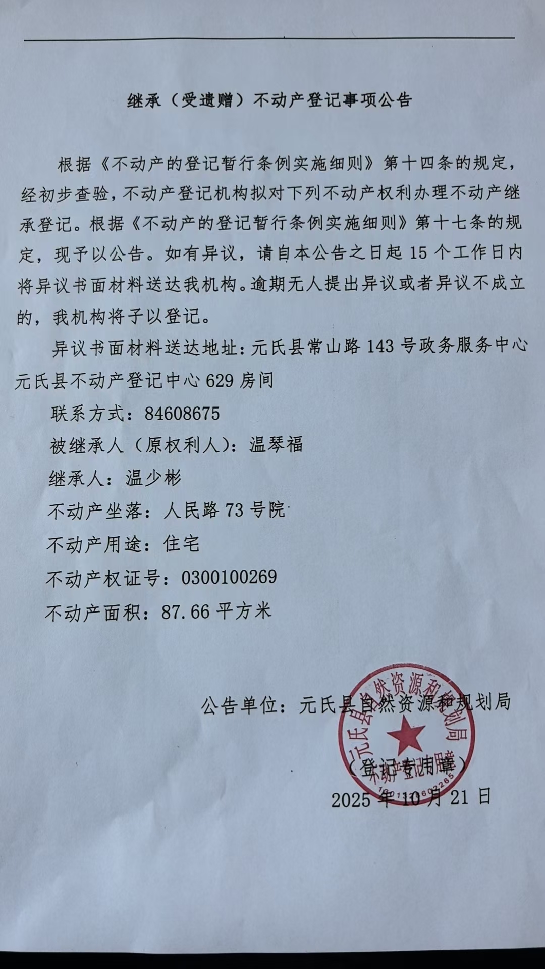 关于温少彬申请继承(受遗赠)温琴福不动产登记事项的公告