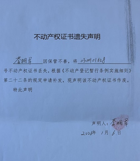 关于李拥军不动产权证书遗失声明的公告