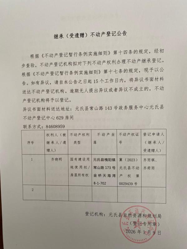 关于齐雨琪、齐莳雨申请继承(受遗赠)齐晓明不动产登记事项的公告
