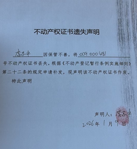 关于李志中不动产权证书遗失声明的公告