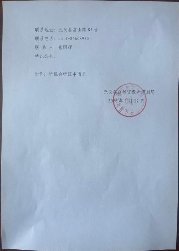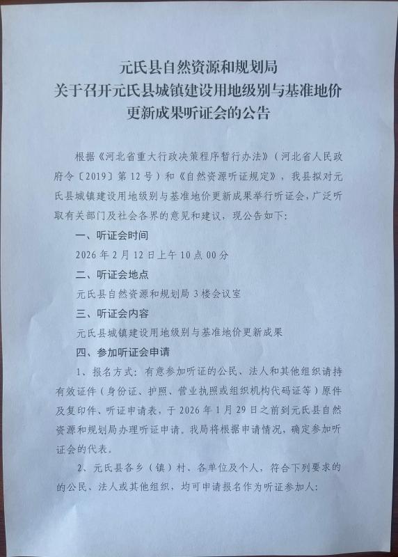 关于召开元氏县城镇建设用地级别与基准地价更新成果听证会的公告