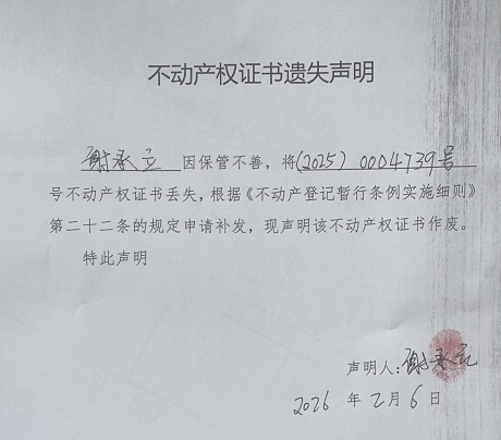 关于谢承立不动产权证书遗失声明的公告