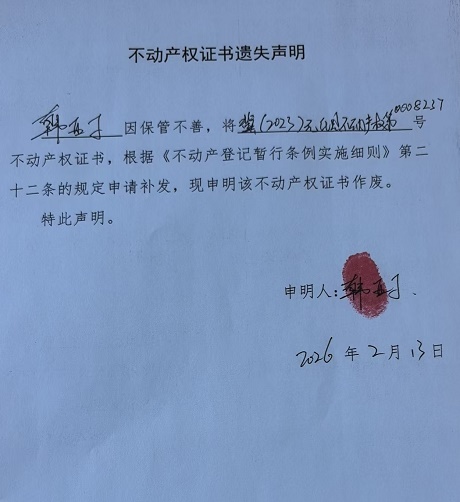 关于韩亚丁不动产权证书遗失声明的公告