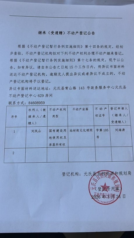 关于刘海涛申请继承(受遗赠)刘凤山不动产登记事项的公告