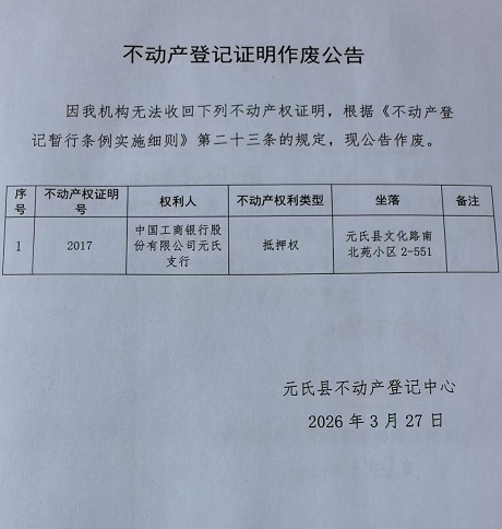 关于中国工商银行股份有限公司元氏支行不动产证明作废的公告