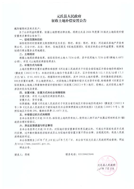 元氏县人民政府征收土地补偿安置公告