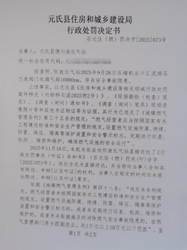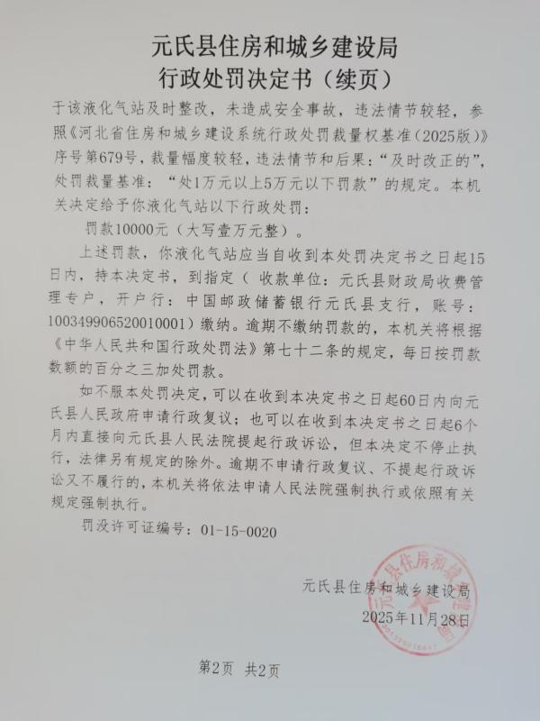 元氏县住建局行政处罚决定书石元住(燃)罚决字〔2025〕073号