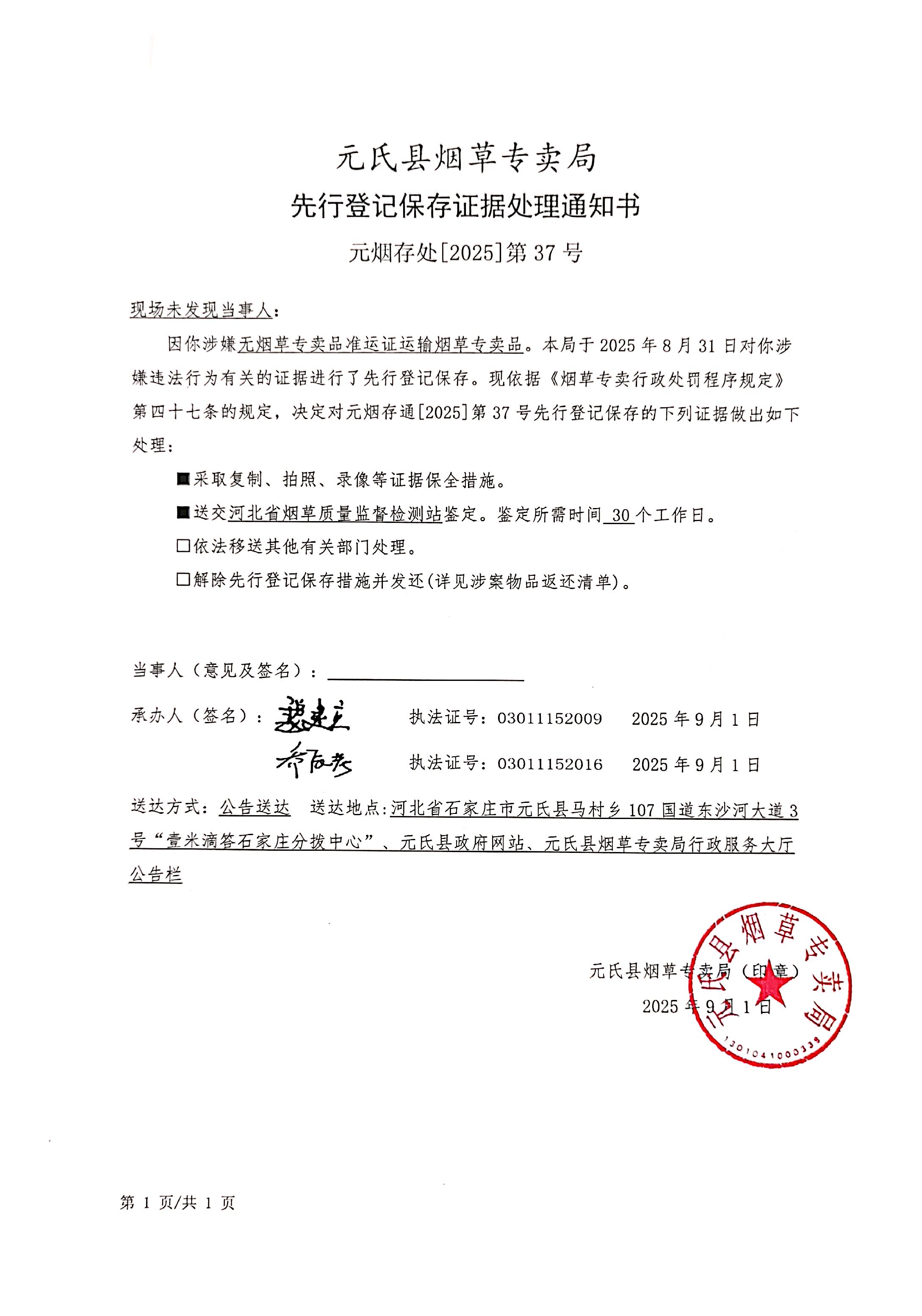 元氏县烟草专卖局先行登记保存证据处理通知书元烟存处[2025]第 37号