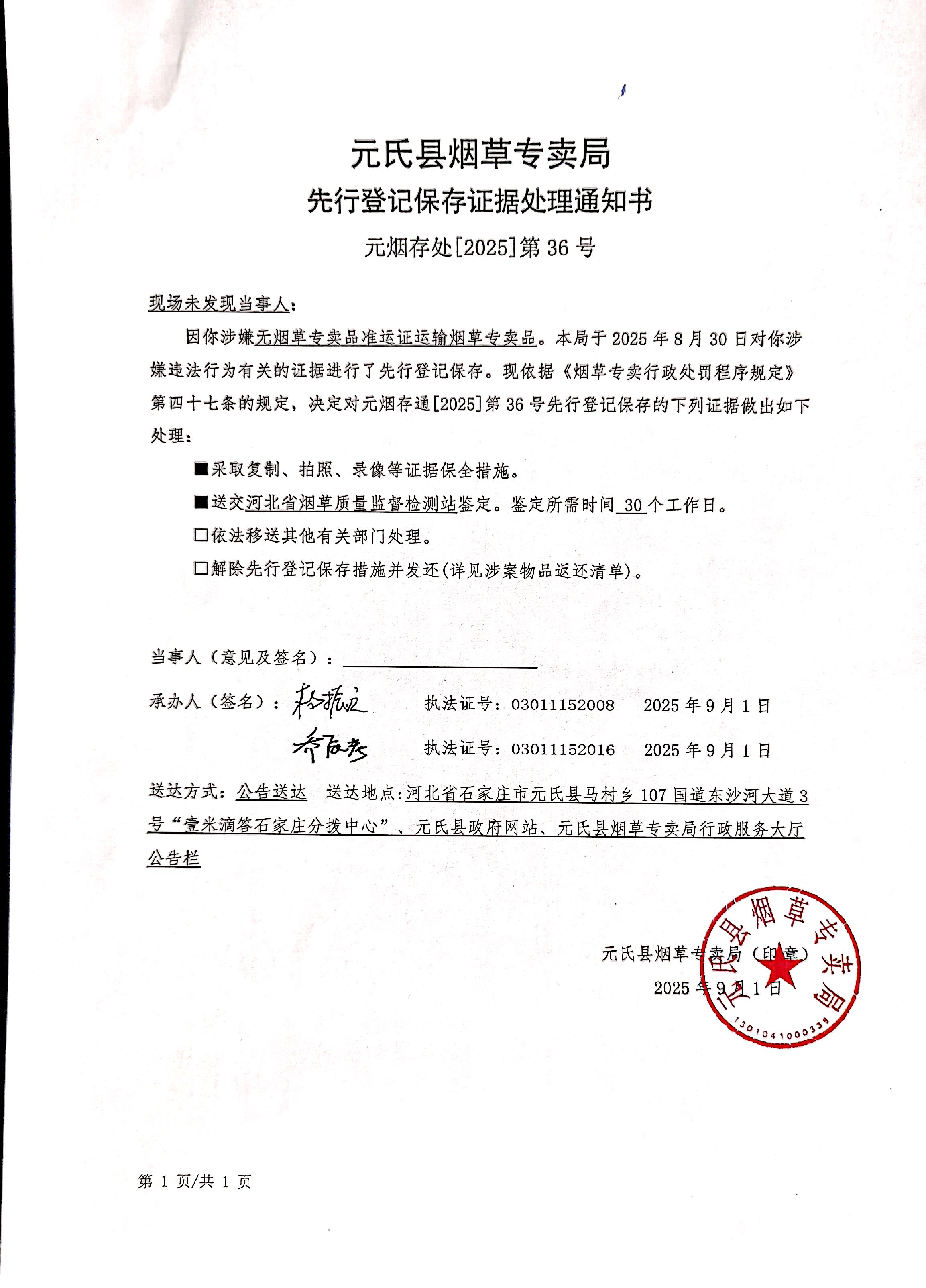 元氏县烟草专卖局先行登记保存证据处理通知书元烟存处[2025]第 36号