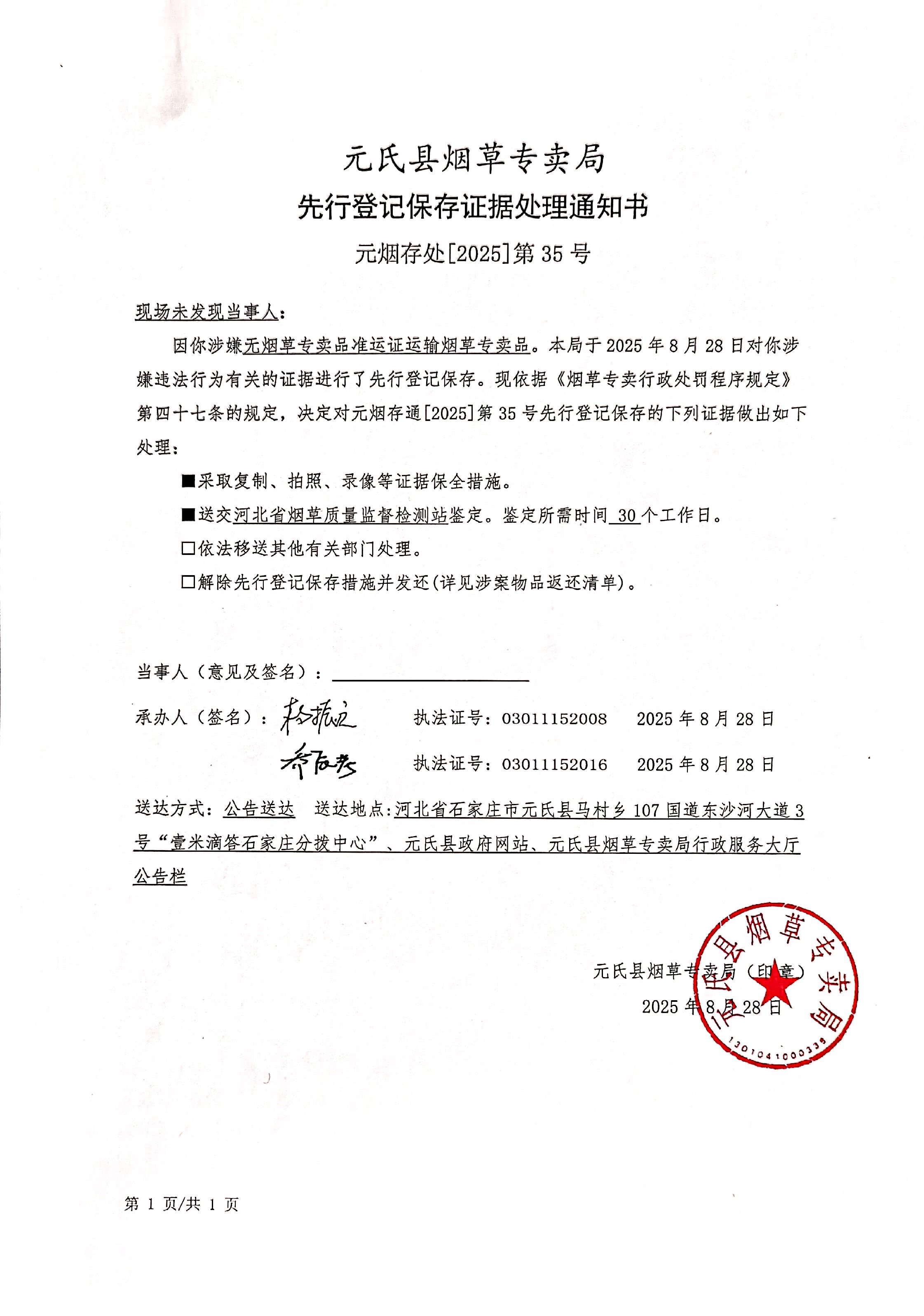 元氏县烟草专卖局先行登记保存证据处理通知书元烟存处[2025]第 35号