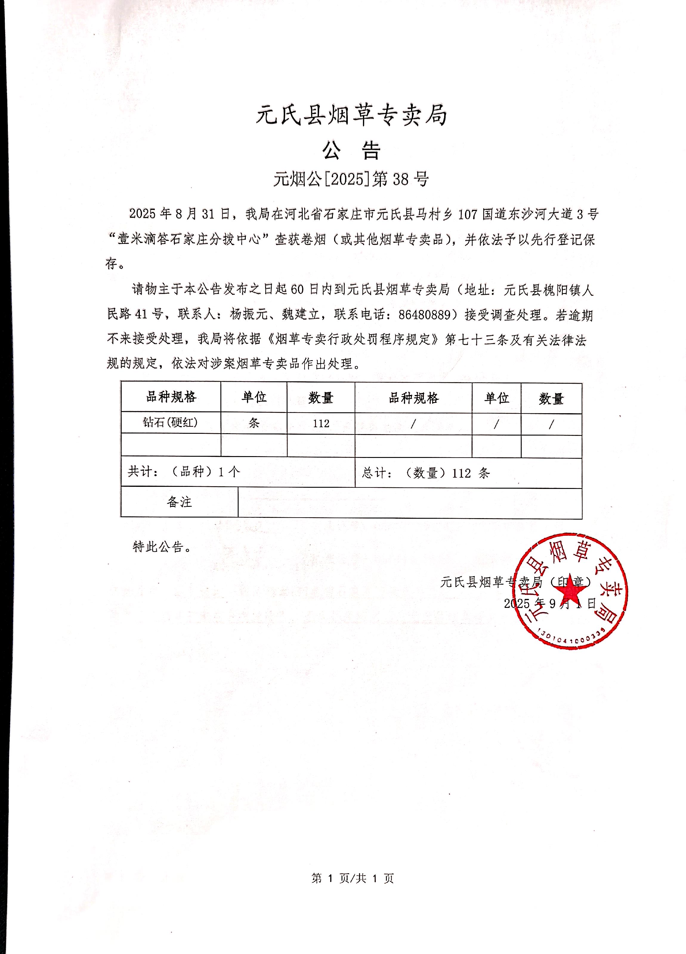 元氏县烟草专卖局公告元烟公[2025]第 38号
