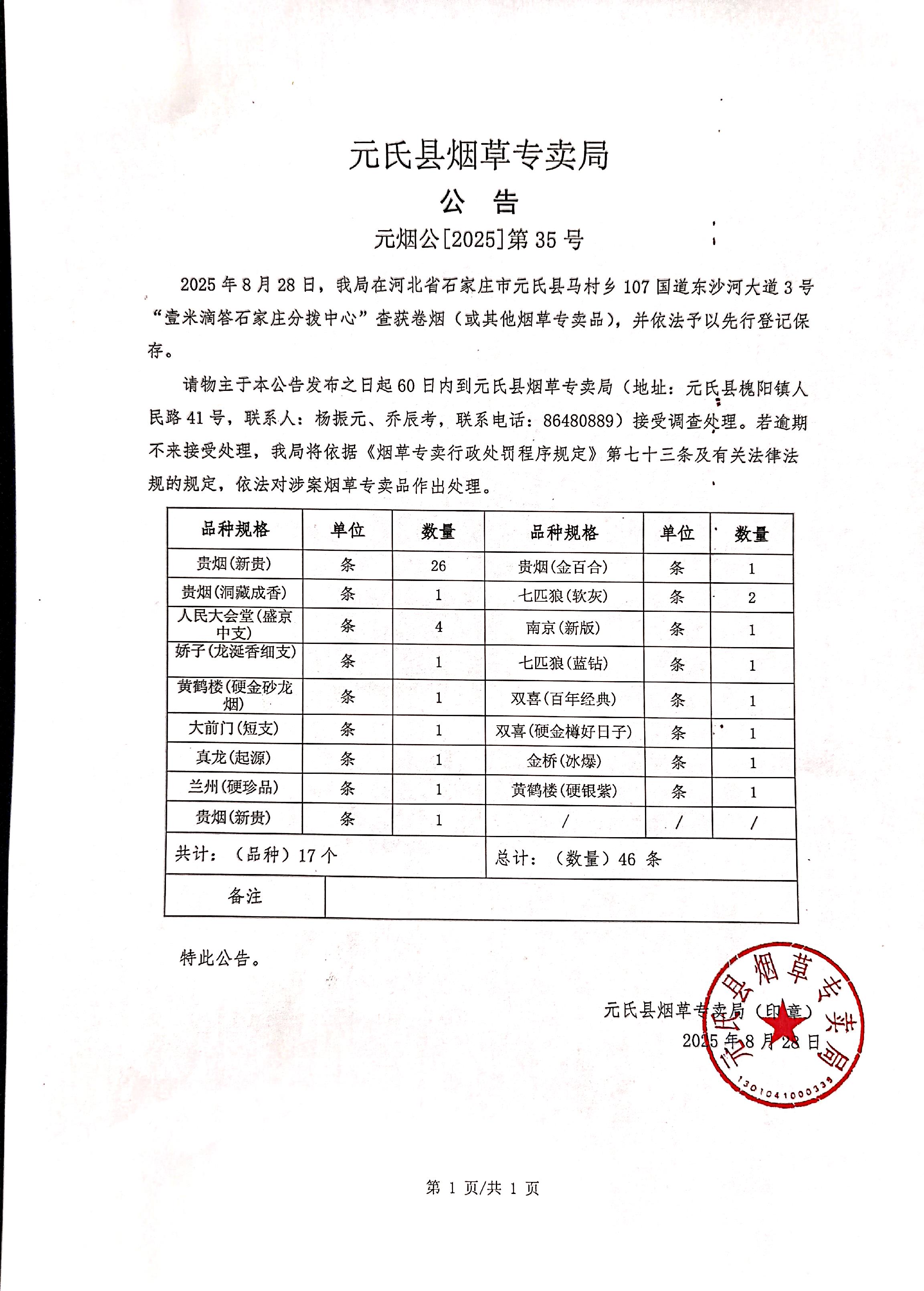 元氏县烟草专卖局公告元烟公[2025]第 35号