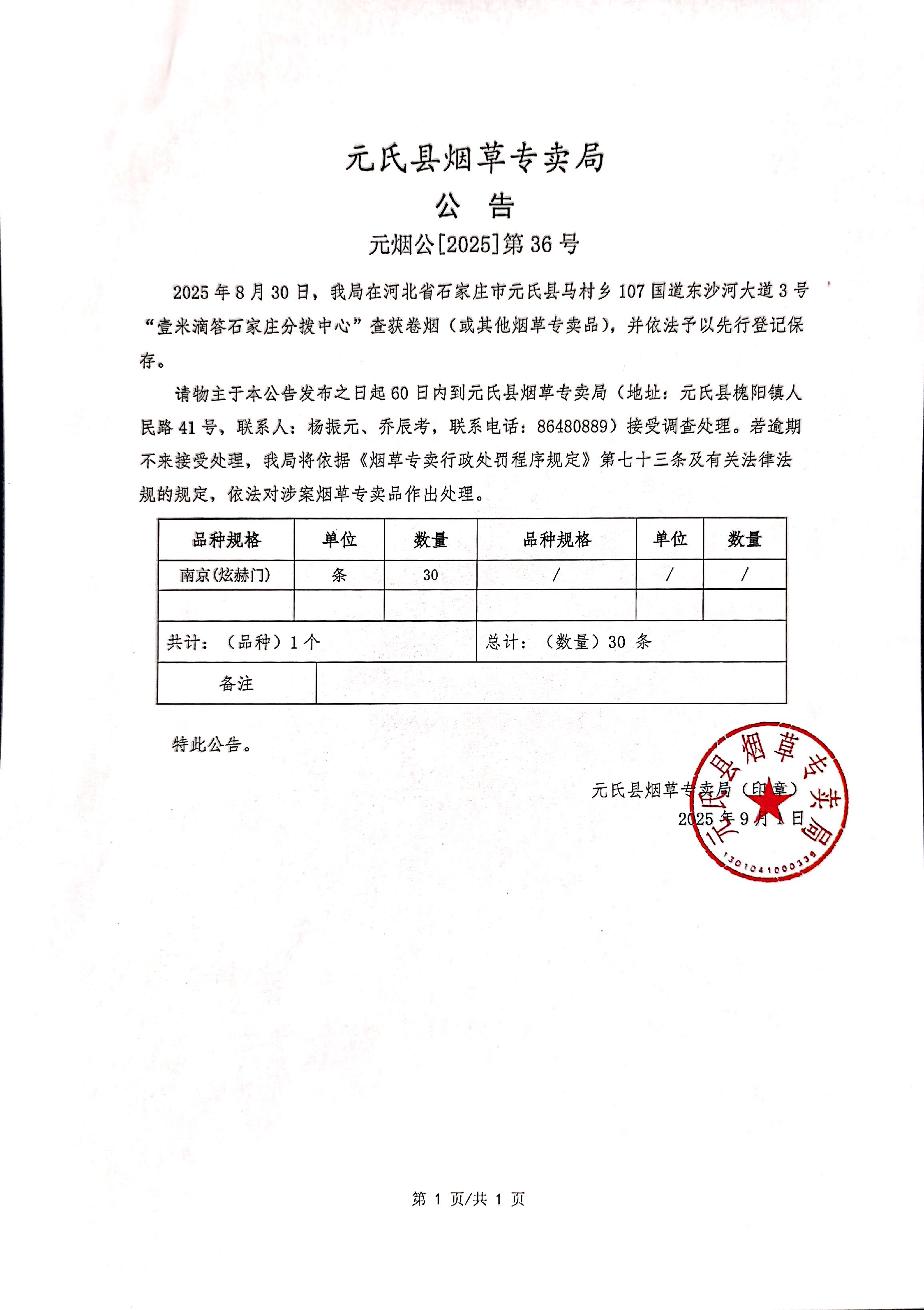 元氏县烟草专卖局公告元烟公[2025]第 36号