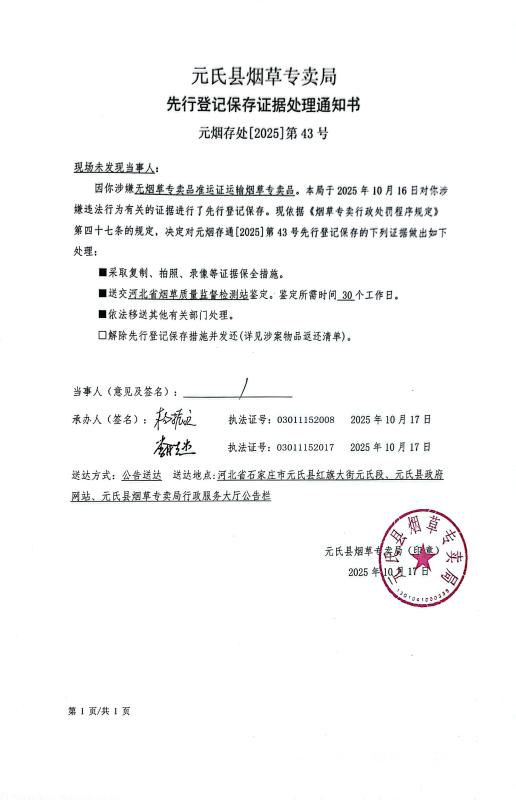 元氏县烟草专卖局先行登记保存证据处理通知书元烟存处[2025]第43号