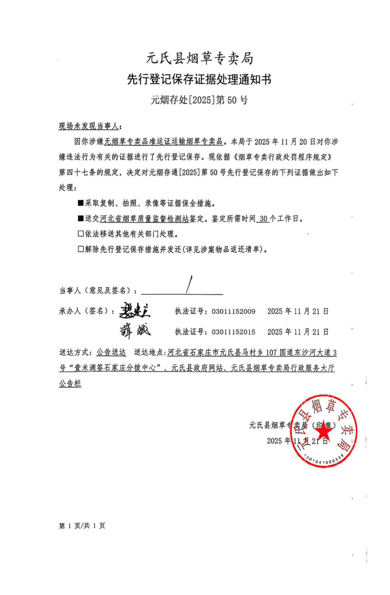元氏县烟草专卖局先行登记保存证据处理通知书元烟存处[2025]第50号