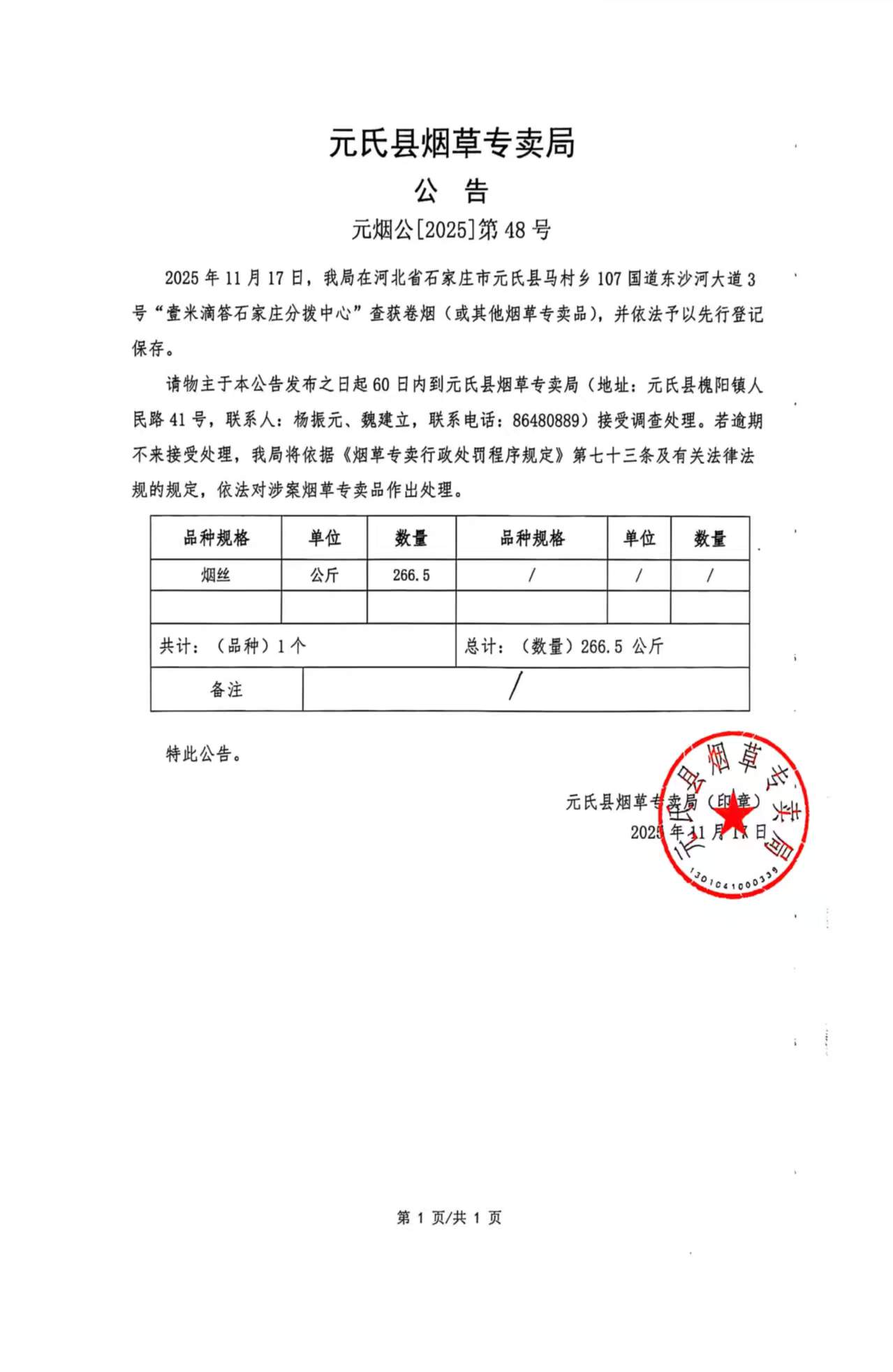 元氏县烟草专卖局公告元烟公[2025]第48号