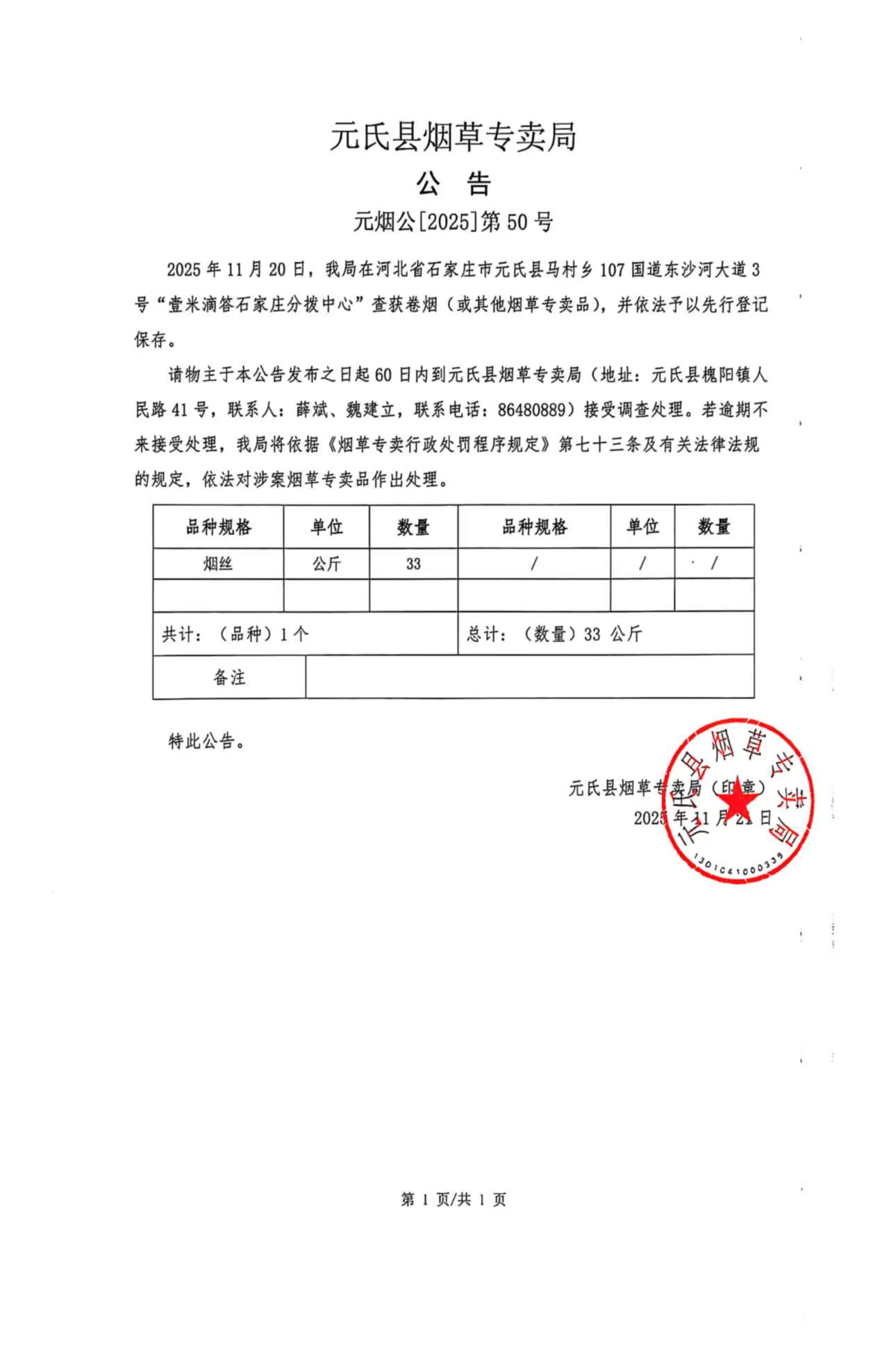 元氏县烟草专卖局公告元烟公[2025]第50号
