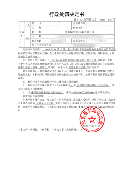 冀0132交罚〔2025〕939号梁山辉鸿汽车运输有限公司道路运输经营者违反车辆技术管理规定行为案