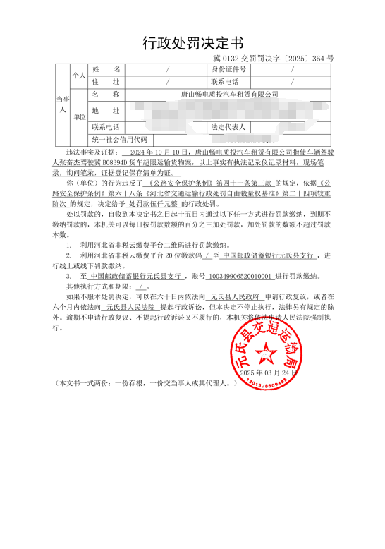 冀0132交罚〔2025〕364号唐山畅电质投汽车租赁有限公司指使车辆驾驶人张奋杰驾驶冀A08394D货车超限运输货物案
