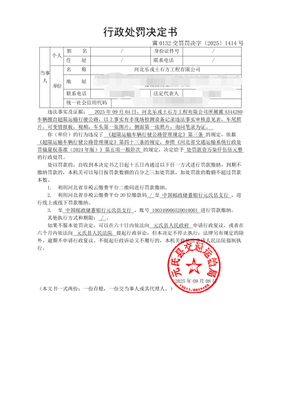冀0132交罚〔2025〕1414号河北乐戎土石方工程有限公司所属冀A34428D车辆擅自超限运输行驶公路案