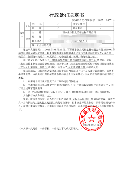 冀0132交罚〔2025〕1457号石家庄市恒发天福建材有限公司冀A35500D车辆擅自超限运输行驶公路案