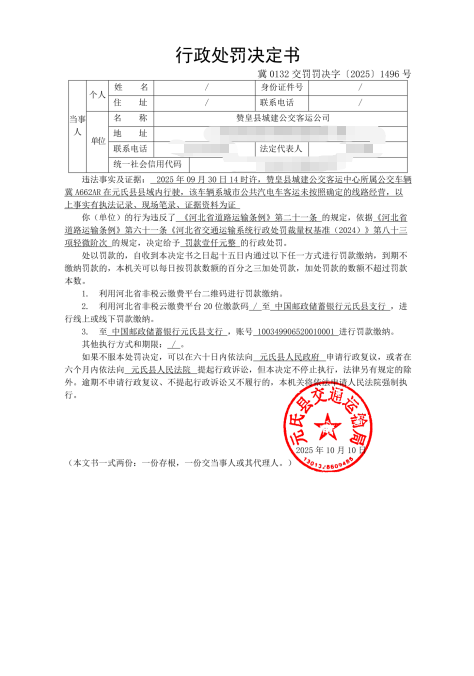 冀0132交罚〔2025〕1496号赞皇县城建公交客运公司所属冀A662AR车辆相关城市公共汽电车客运经营者不按线路行驶行为案
