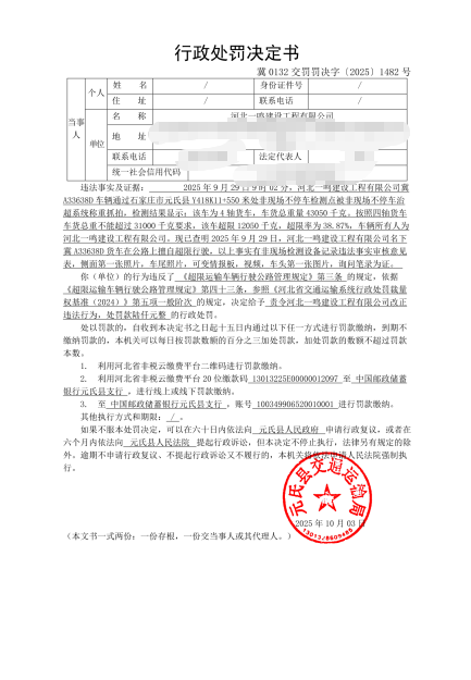 冀0132交罚〔2025〕1482号河北一鸣建设工程有限公司所属车辆冀A33638D擅自超限运输货物行驶公路案