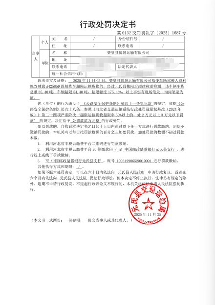 冀0132交罚〔2025〕1687号赞皇县博晟运输有限公司指使车辆驾驶人贾利魁超限运输货物案