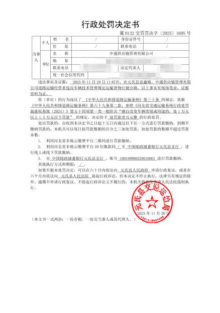 冀0132交罚〔2025〕1695号中通供应链管理有限公司道路运输经营者违反车辆技术管理规定行为案