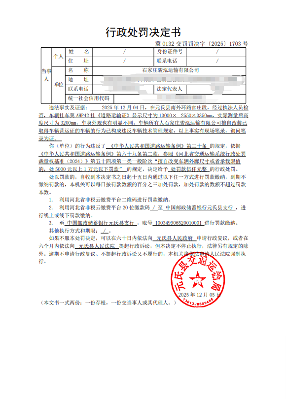 冀0132交罚〔2025〕1703号石家庄骏泓运输有限公司道路运输经营者违反车辆技术管理规定行为案