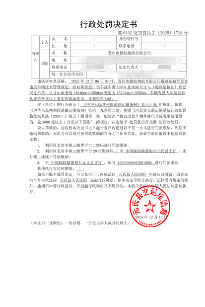冀0132交罚〔2025〕1718号晋州市捷航物流有限公司道路运输经营者违反车辆技术管理规定行为案