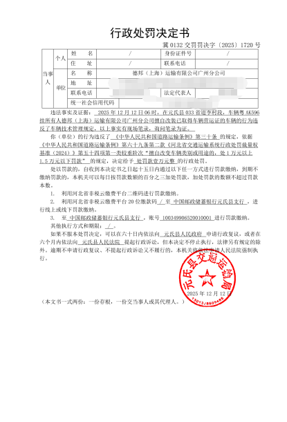 冀0132交罚〔2025〕1720号德邦(上海)运输有限公司广州分公司道路运输经营者违反车辆技术管理规定行为案