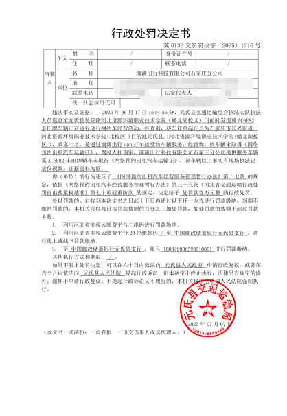 冀0132交罚〔2025〕1216号滴滴出行科技有限公司石家庄分公司网约车平台公司违反网约车经营服务管理规定行为案