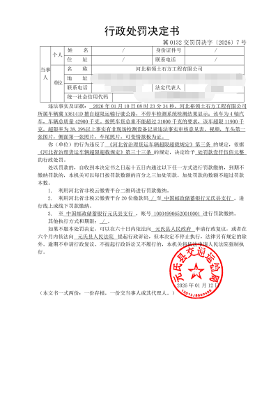 冀0132交罚〔2026〕7号河北裕领土石方工程有限公司所属车辆冀A36141D擅自超限运输行驶公路案