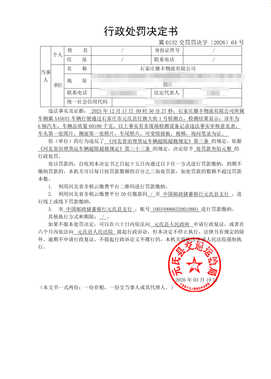 冀0132交罚〔2026〕64号石家庄雄丰物流有限公司所属车辆冀A456XS擅自超限运输行驶公路案