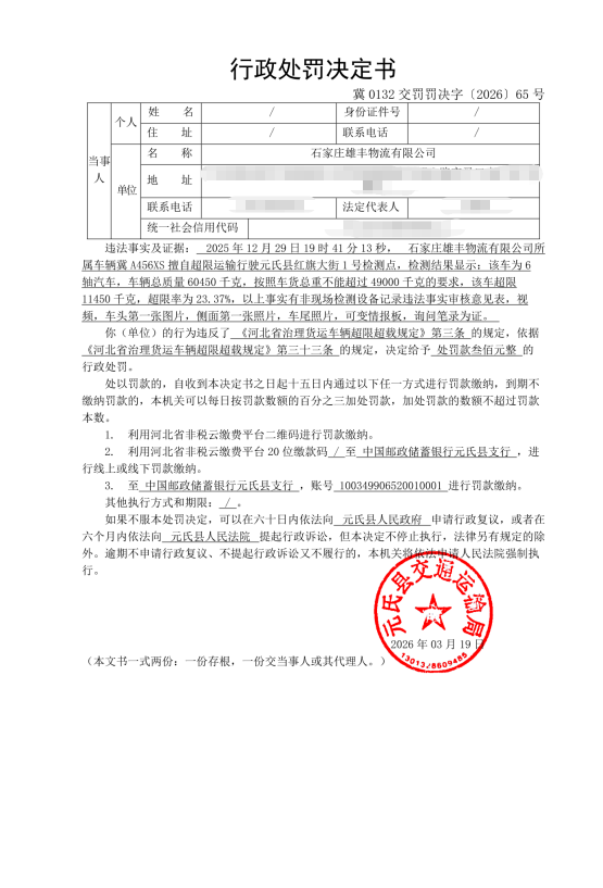 冀0132交罚〔2026〕65号石家庄雄丰物流有限公司所属车辆冀A456XS擅自超限运输行驶公路案